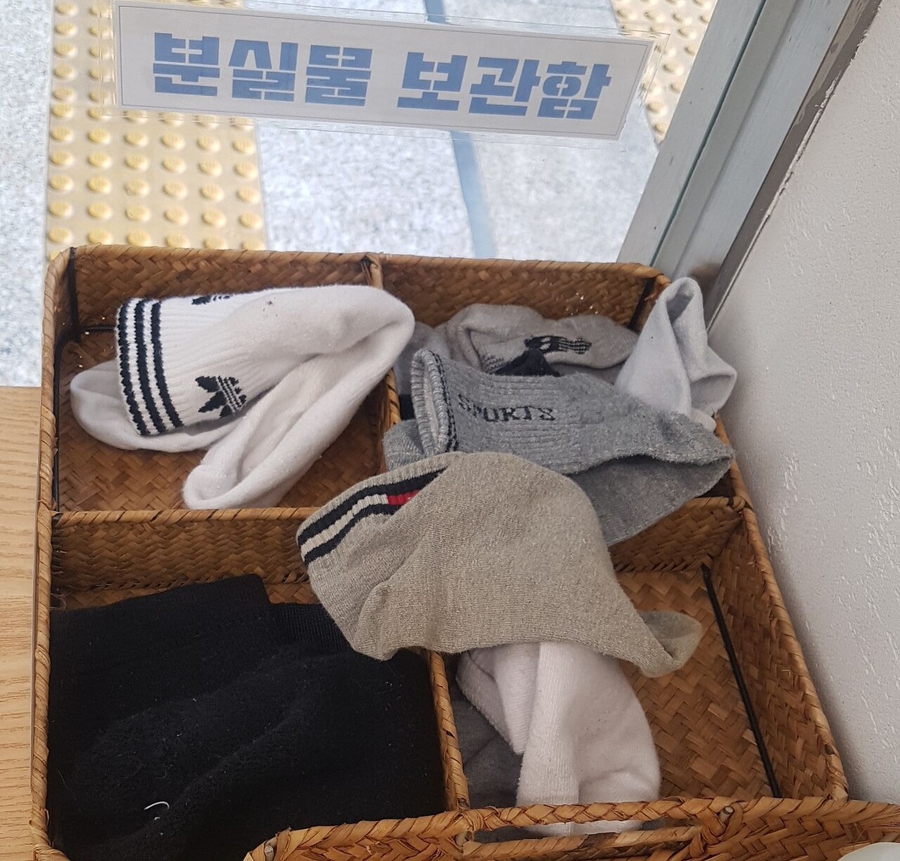 양말이 분실되어 분실물 보관함에 모여있네요.(위 사진)