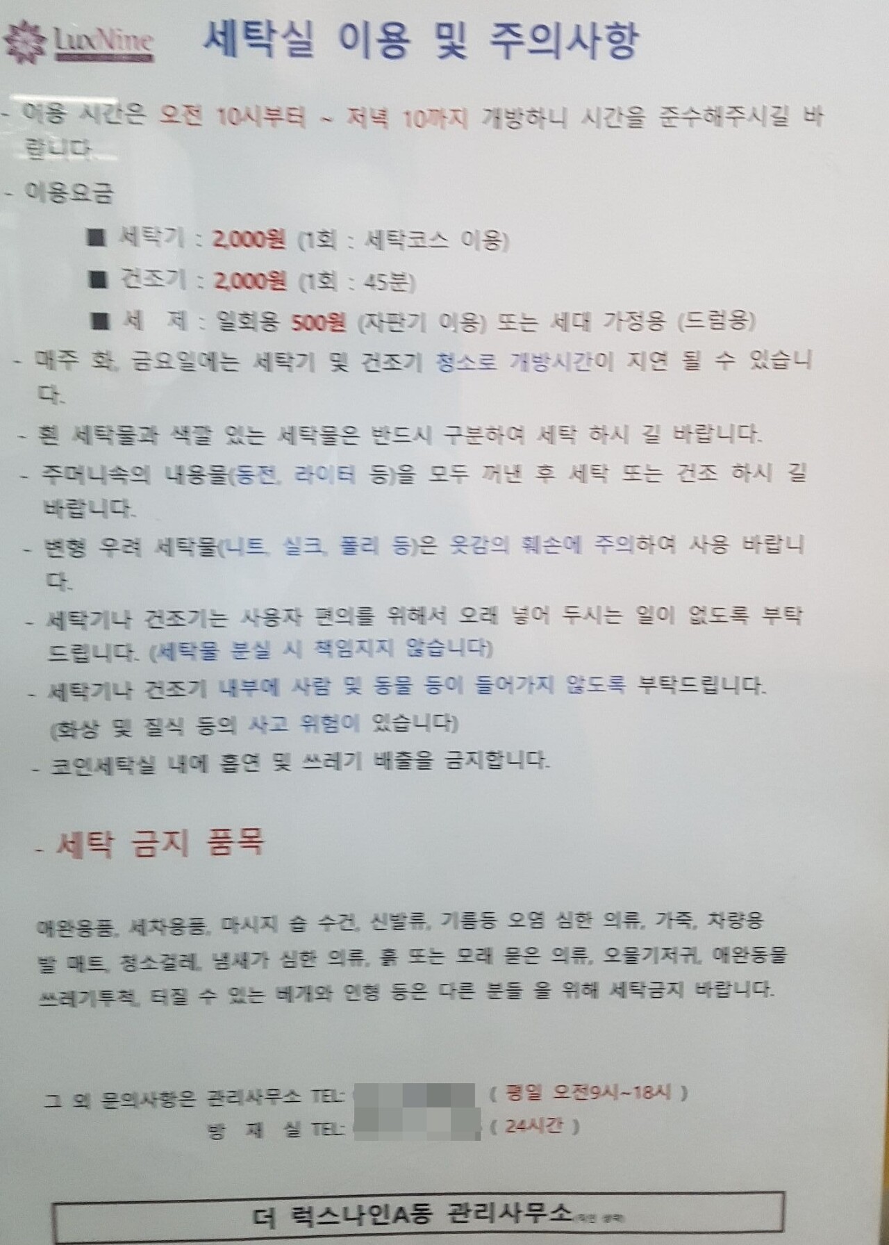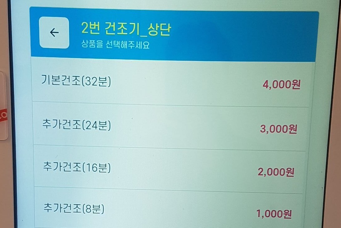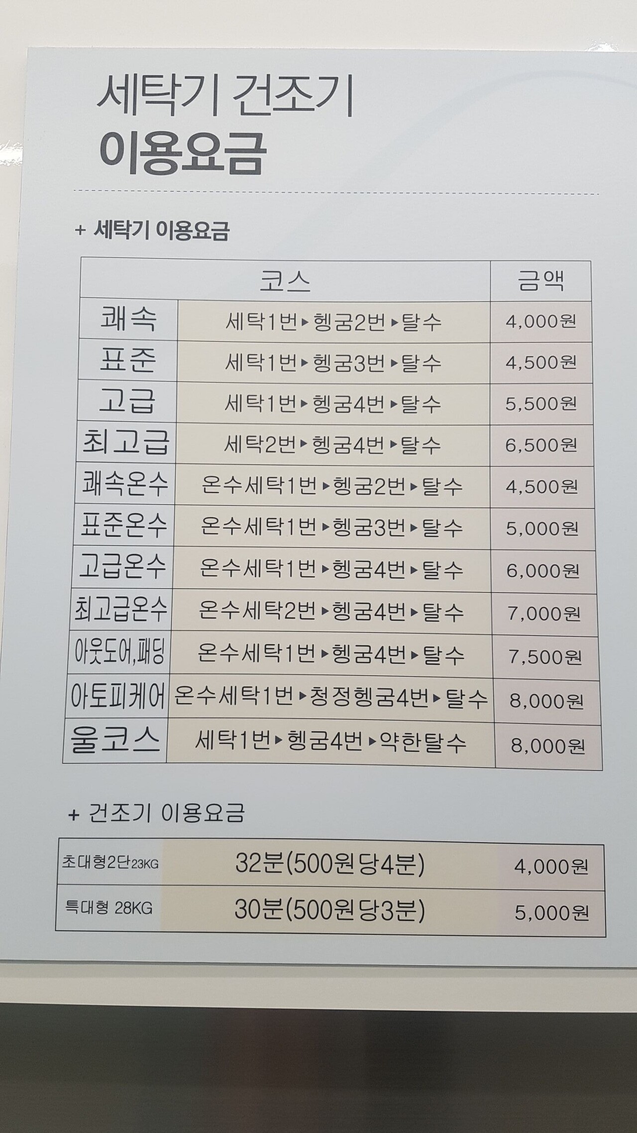 위 사진을 보니, 표준세탁 4천 원, 기본건조 4천 원 정도입니다. 지하 커뮤니티 시설의 2천 원 보다 2배 이상 비싼 가격인데, 사람들이 여기도 이용하는 것 같습니다. 왜 그런지는 잘 모르겠네요.