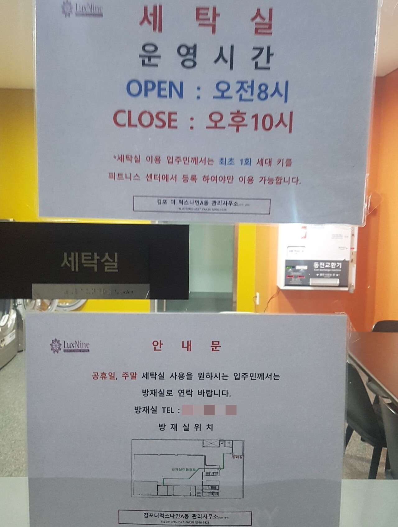 상가가 대부분 공실이고, 주변에 유동인구도 많이 않은 곳이라, 주차할 수 있는 공간은 아주 많았습니다. 지하 1층 커뮤니티 시설에 들어가 보니, 무인 세탁실도 있었습니다. 사용요금은 세탁기와 건조기가 각각 2천 원인 것 같습니다.