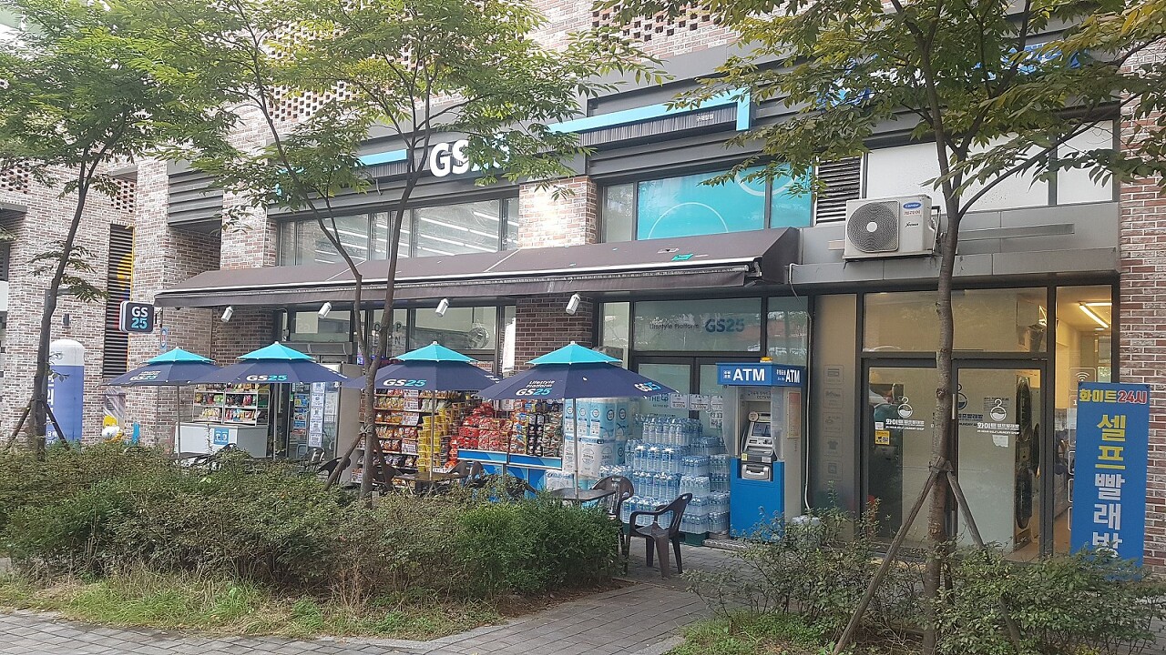 지상 1층으로 올라와보니, 한 번도 임대가 맞춰지지 않은 듯한 깨끗한 공실상가들이 많이 보입니다. 해당 상가를 분양받은 수분양자들은 대출이자에 관리비까지 속이 타들어갈 것 같습니다. 건물 외부로 나와보니 아래 사진과 같이 좌측에 GS25와 우측에 무인 빨래방이 보입니다.