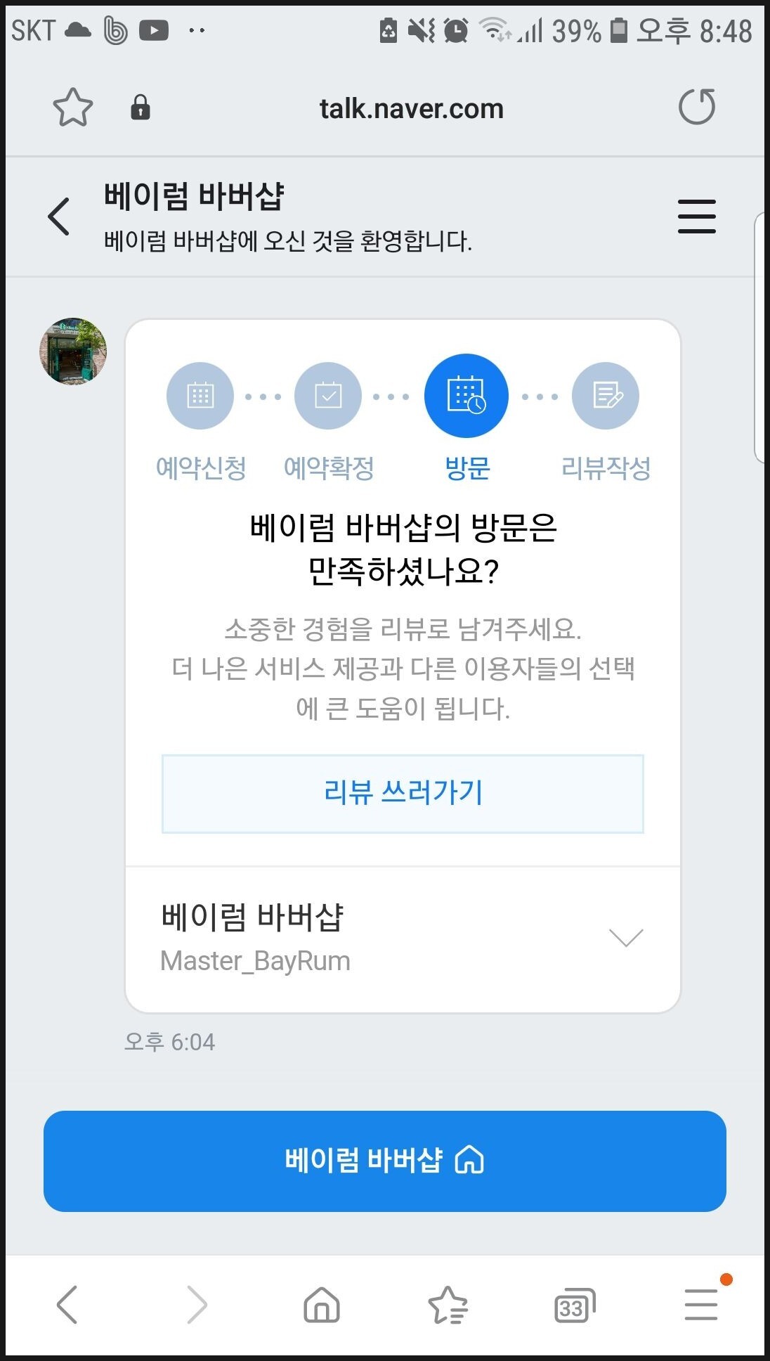 비용은 4만 원이었고, 네이버에 리뷰도 작성하였습니다. 네이버로 예약하여 업체에 방문을 하게 되면, 아래와 같이 리뷰작성이 가능하도록 알림이 발송됩니다.