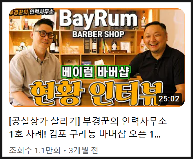 부경꾼 유튜브에 나왔던 김포 베이럼 바버샵입니다. 네이버에서 예약을 하고 방문하였는데, 유튜브 영상에서 나왔던 마스터 바버 님과 다른 직원분이 한 분 있었습니다. 마스터 바버 님에게 거의 1시간 가까이 머리손질을 받았고, 일반적인 미용실에서 하는 것보다는 새롭고 다양한 서비스를 많이 받았습니다. 몸으로 머리카락이 들어가지 않게 여러 겹으로 밀봉을 하고, 다양한 바리깡을 번갈아가며 사용했으며, 기위로도 아주 세심하게 손질해 주었습니다.