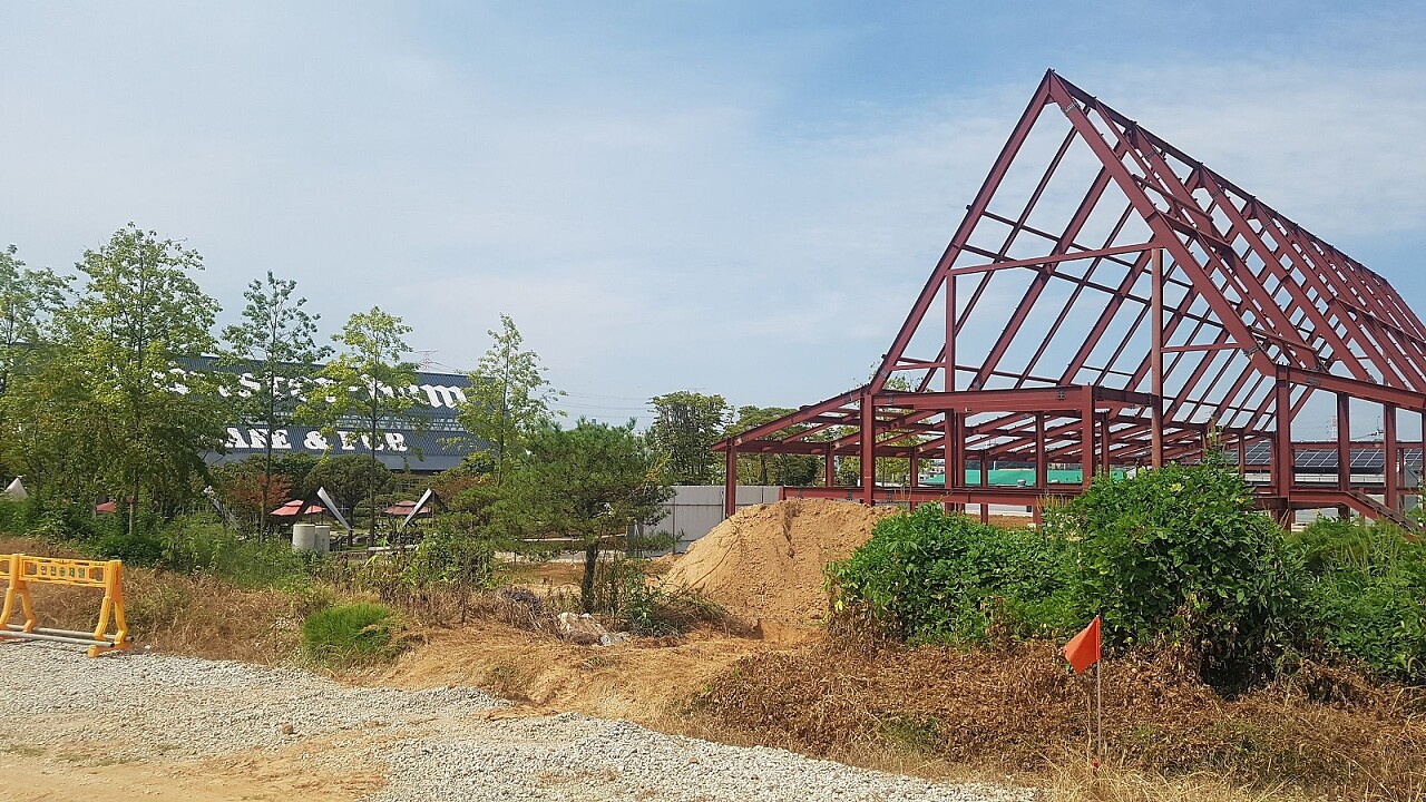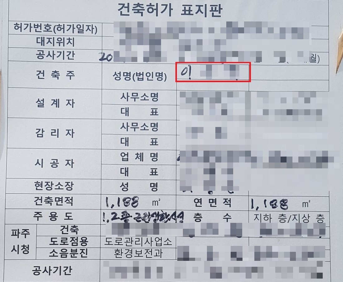 혹시나 했더니 역시나.. 비슷한 건물을 하나 더 지어 카페를 확장하는 것으로 보입니다. 건축허가 표지판을 보니, 신축 중인 건물의 건축주와 영수증상의 사업주가 동일인이네요. (아래사진)