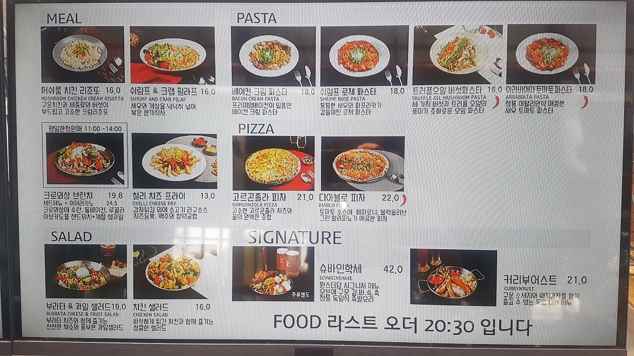 아이스크림, 리조또, 파스타, 브런치, 샐러드, 피자 등 다양한 메뉴가 있습니다. (위 사진)