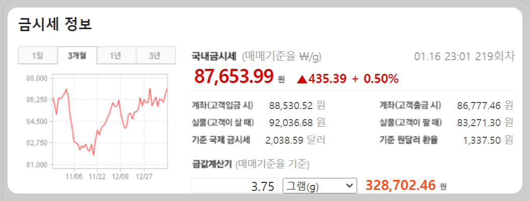 현재의 금 시세는 매매기준율로 볼 때 1그램당 87,000원 수준이네요. 최근 3개월로 볼 때, 오름세인 것 같습니다. 위 그래프를 확인해 보시길 바라겠습니다. 참고로, 3.75그램당 328,000원 수준입니다. 3.75그램은 1돈입니다. 금시세정보를 확인할 때, 네이버를 조회하면 위와 같이 나오는데, 참 편리한 세상 같습니다. 현재 가격뿐만 아니라, 기간별 등락 등도 잘 보여주고 있네요.