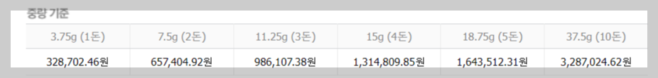 위 표는 1돈에서 10돈 기준의 가격을 그래프로 나타낸 것입니다. 참고하시기 바랍니다. 아무래도 우리나라 사람에게는 그램보다는 1돈, 2돈 하는 개념이 익숙하네요. 1돈에 3.75그램이라는 사실을 모르셨던 분들도 많을 것 같습니다. 예전에 돌반지 샀던 생각도 새록새록 나네요.