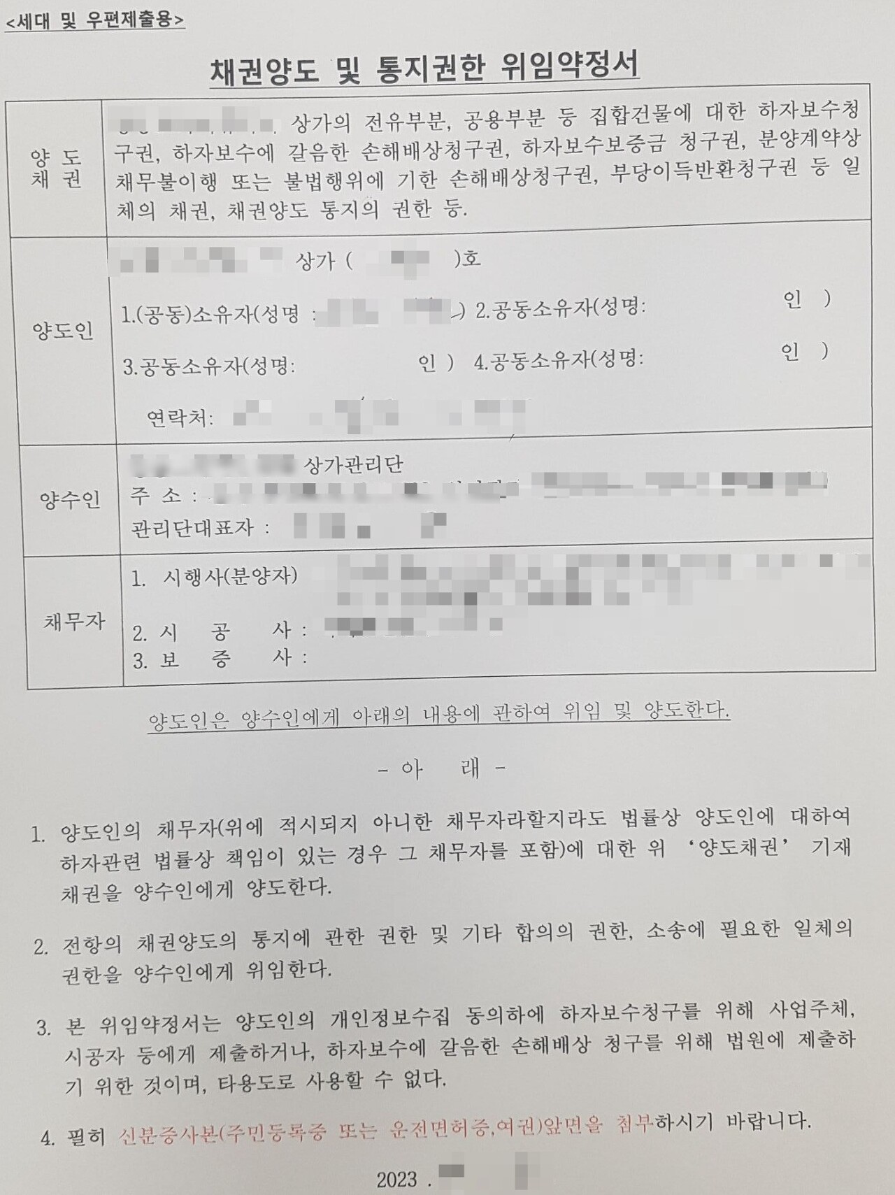 대부분의 구분상가 소유자가 동의한 상태이고, 해당 건물의 하자를 찾기위해 설계사무소에 의뢰한 상태라고 합니다. 저도 크게 손해볼 일은 없다고 생각하여, 채권양도 및 통지권한 위임 약정서를 작성하였습니다.