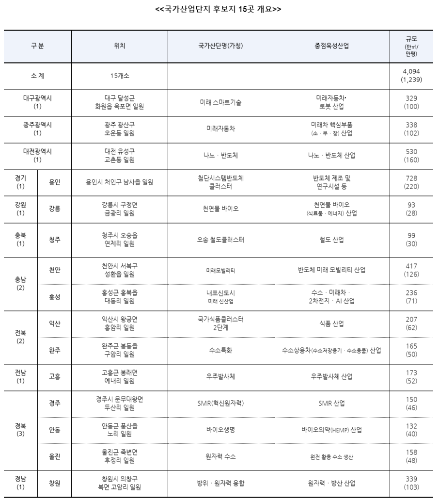 국토교통부는 글로벌 패권 경쟁이 심화되고 있는 반도체, 미래 모빌리티, 방산, 우주발사체, 수소 등 첨단산업 육성을 위해 국가산단 후보지 15곳을 신규 선정해, 지역이 첨단산업 거점이 되고 국가 경제발전을 견인할 수 있는 기반을 마련했습니다. 참고로, 관련 국토교통부 보도자료 원문을 아래에 링크해 드리겠습니다.( 국토교통부 그림을 클릭하시면 해당 보도자료로 이동합니다. )