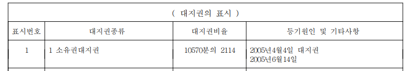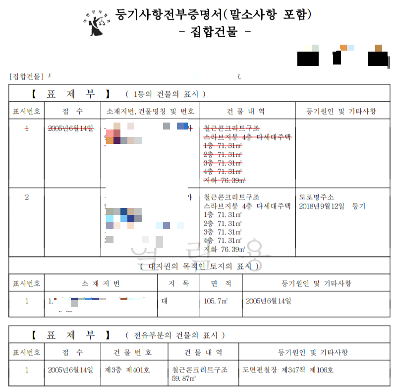 위 등기사항전부증명서, 통상 등기부등본이라 부르는 서류상의 표제부에는 해당 건물의 소재지번, 건물명칭 및 번호, 면적과 대지권 비율 등이 적혀있습니다.