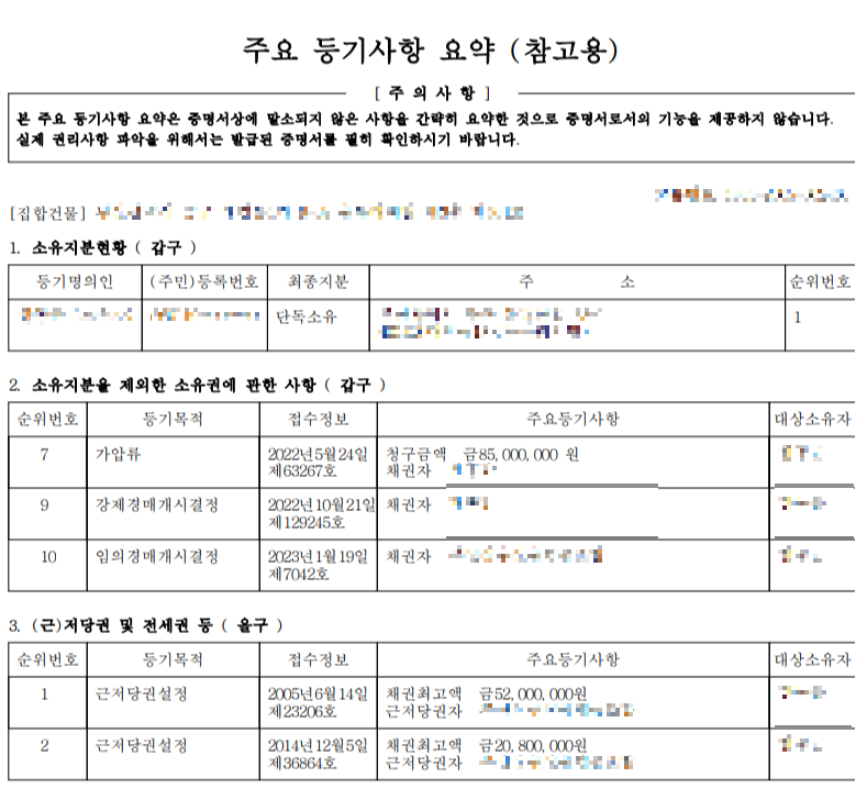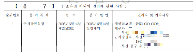 갑구에서는 위와 같이 소유권자의 성명, 주민번호, 주소 등을 확인할 수 있습니다.