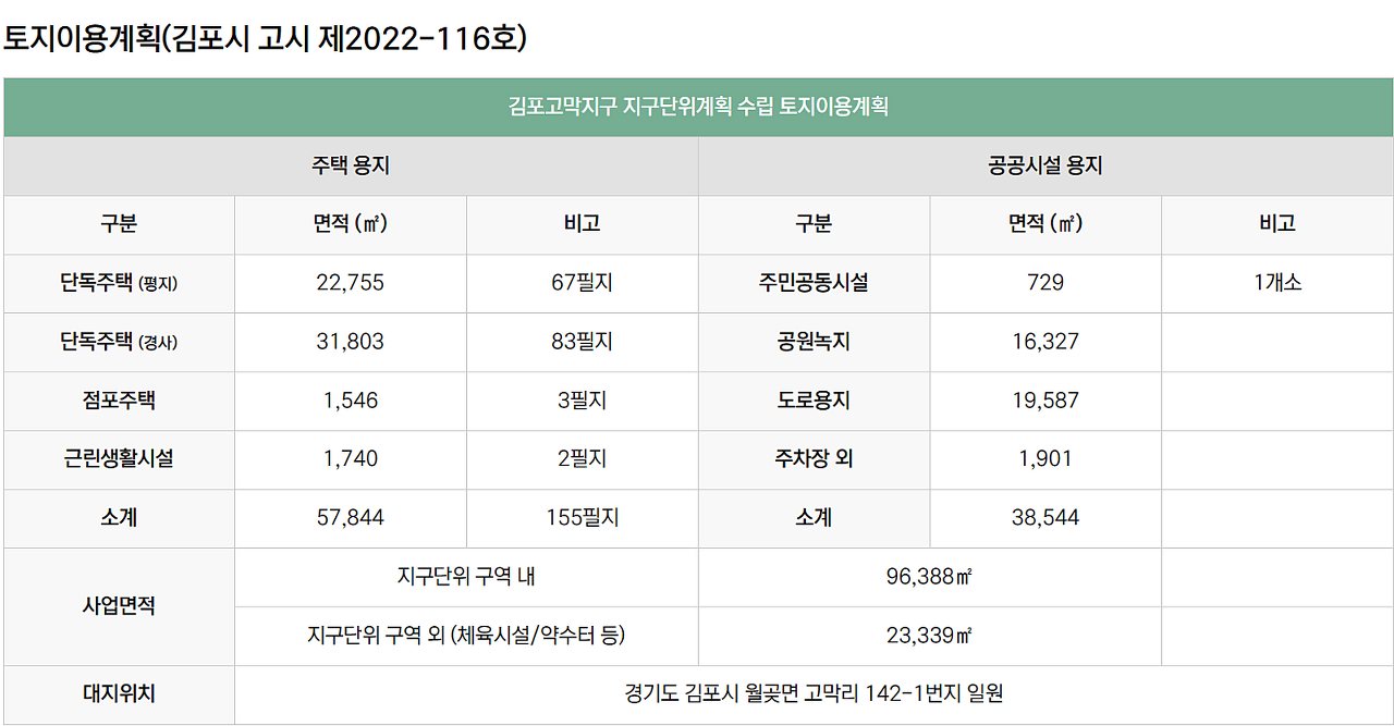 김포 고막지구 지구단위계획이 수립되어 있습니다. 주택용지 중 단독주택(평지) 면적은 22,755 제곱미터, 67필지이고, 단독주택(경사지) 면적은 31,803 제곱미터, 83필지 입니다. 점포주택 3필지와 근린생활시설 2필지 포함 총 155필지입니다. 공공시설 용지 중 주민공동시설, 공원녹지, 도로용지, 주차장 등의 면적은 38,544 제곱미터로 되어 있네요. 해당 사업지의 주소지는 경기도 김포시 월곶면 고막리 142-1번지 일원입니다.