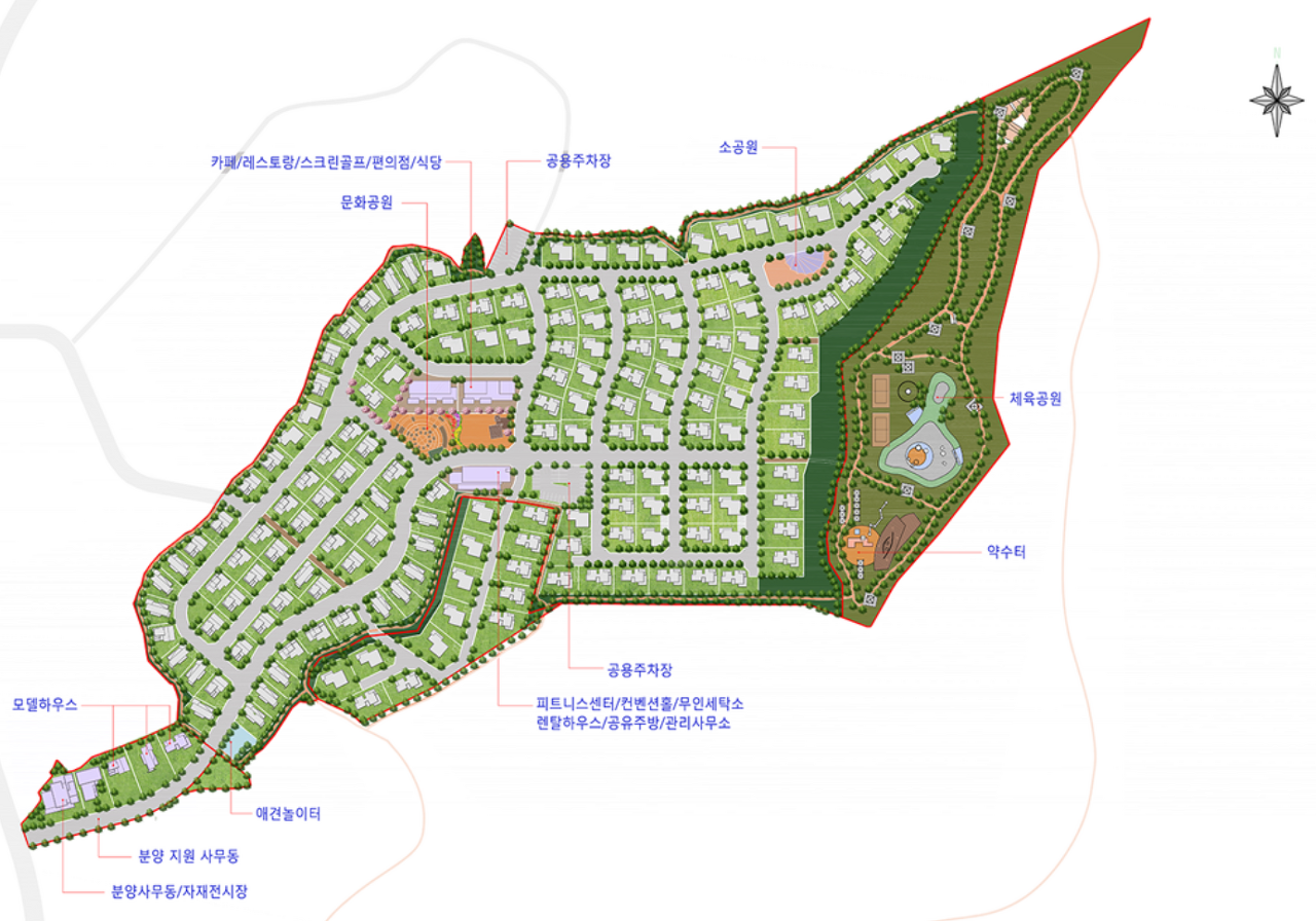 위 지도를 보니, 해당 사업지는 김포의 북서쪽, 강화도에서 가까운 쪽에 위치해 있습니다. 주변에 문수산, 김포대학교, 강화대교, 김포씨사이드 CC 등이 있는 것으로 보이네요. 아래는 해당 전원주택 단지의 완공 후 조감도 모습으로, 주변에 울창한 숲이 해당 사업지를 감싸고 있는 것으로 보입니다.