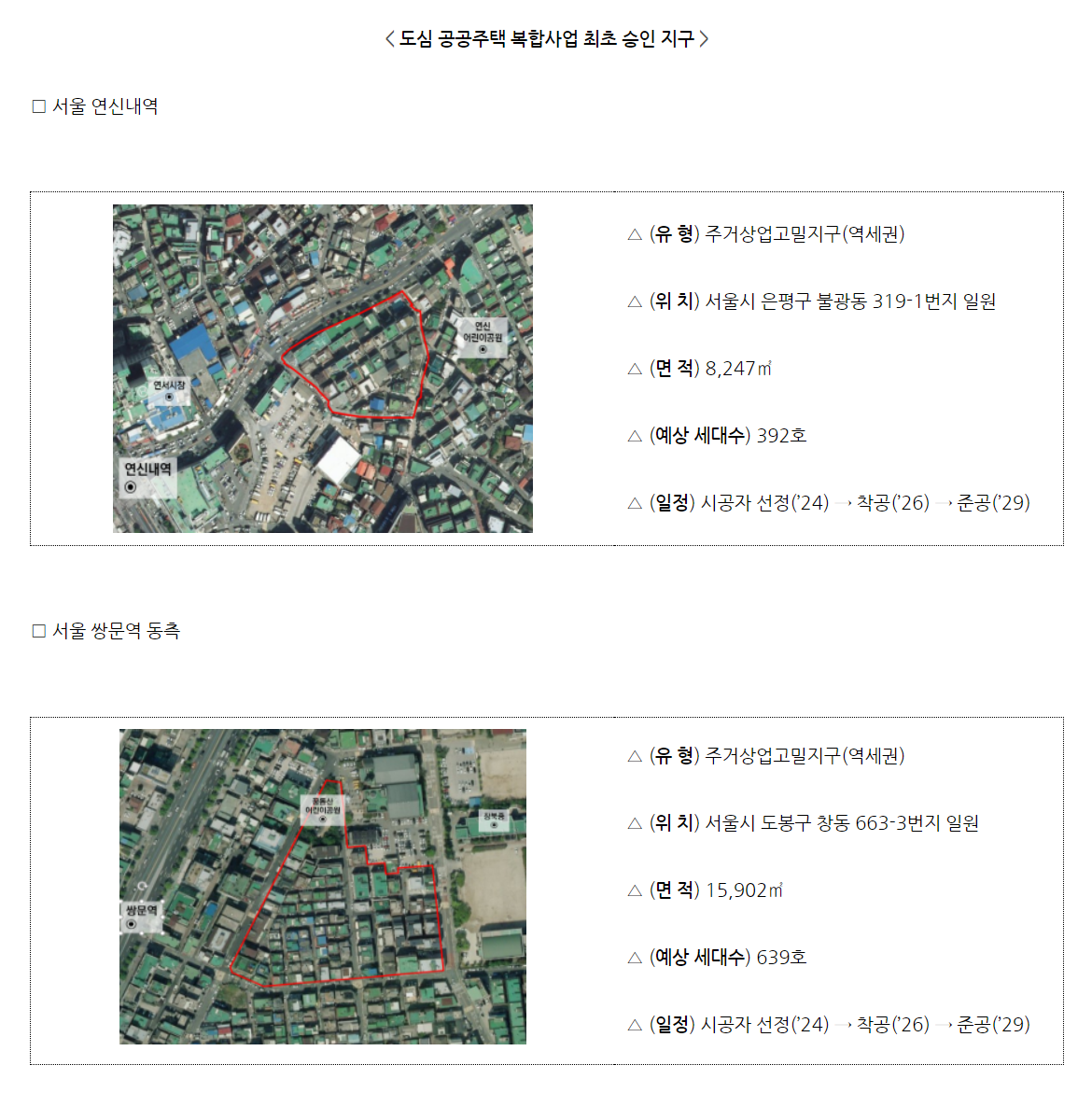 국토교통부는 2021년 12월에 복합지구로 지정하였던 4곳 3천여호(연신내역 392호, 쌍문역 동측 639호, 방학역 420호, 부천원미 1,628호)에 대해 도심 공공주택 복합사업(민간 재개발 사업성이 부족했던 노후도심지를 대상으로 공공에서 주도하여, 용적률 등에 대해 혜택을 부여하고 공원 및 생활 SOC 등과 함께 주택을 신속히 공급하는 사업) 최초로 경기도가 2023.12.28일, 서울시가 2023.12.29일 복합사업계획 승인을 고시한다고 밝혔습니다.