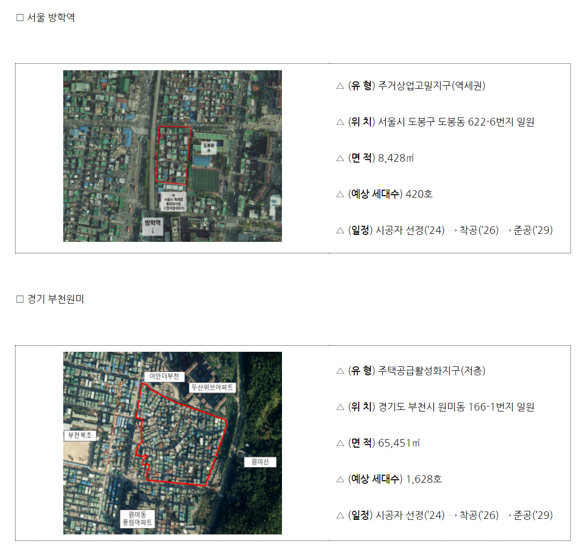 도심 공공주택 복합사업이 최초승인되어, 연신내역 392호, 쌍문역 639호, 방학역 420호, 부천 원미 1,628호가 공급 예정이라고 합니다. 지난 12월 서울·경기도 최초의 도시복합사업이 승인되면서 2024년 1.9만 호 규모의 지구지정 계획이 본격화됐습니다. 주택사업 인허가가 민간정비사업보다 3~4년 이상 앞당겨 완료되었다고 합니다. 참고로 아래에 국토교통부 보도자료를 링크해 놓았으니 확인해 보시길 바라겠습니다.