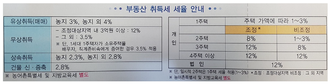 위 사진은 등록면허세 납부서 겸 영수증 뒷면인데, 부동산 취득세 세율이 안내되어 있네요. 개인 명의의 주택은 4 주택 이상일 시 비조정 지역도 취득세가 12%이고, 법인은 12%로 고정입니다. 거기에 농어촌 특별세 및 지방교육세는 별도입니다. 부동산에 대한 취득세 부담이 심하여 요즘에는 주택투자를 많이 꺼리는 것 같고, 대출금리 상승 등이 동반되어 집값이 많이 떨어지고 있습니다. 무조건 아파트 분양받기만 하면 부자가 될 것 같았던 2020~2022년 부동산 가격 폭등기가 엊그제 같은데, 지금은 거래자체가 많지 않고 공인중개사도 상당수가 폐업한다는 언론기사가 나오고 있습니다. 정말 투자는 쉽지 않다는 것을 경험으로써 배우고 있네요.