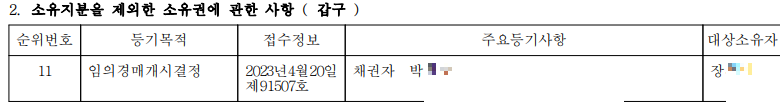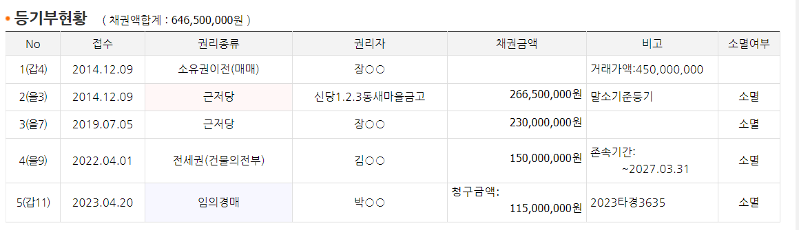 경매정보지상 채권합계액이 646,500,000원이고, 선순위로 근저당이 2건, 전세권 1건이 있는데, 이보다도 후순위 권리자인 박 모 씨가 임의경매 신청을 한 것으로 보입니다. 하지만 실제 등기사항 전부증명서를 확인해 보니, 장 모 씨가 2014년 매매로 소유권이전을 하면서 새마을금고에 2억 이상의 대출(근저당권 금액은 266,500,000원)을 받았고, 2019년에 개인인 장 모 씨와 박 모 씨로부터 2억 내외의 금액(근저당권 금액은 230,000,000원)을 추가로 빌린 것으로 추정됩니다. 전세권은 현 임차인인 김 모 씨가 150,000,000원을 설정한 것으로 보이네요. 특이한 것은 경매신청을 박 모 씨가 했다는 것입니다. 아마 선순위 근저당권자에게는 이자를 잘 갚고 있다든지, 어떠한 협의를 통하여 경매접수 까지는 끌고 가지 않은 것으로 보입니다. 경매정보지와는 다르게, 실제 채권합계액은 530,000,000원 수준으로 보입니다.