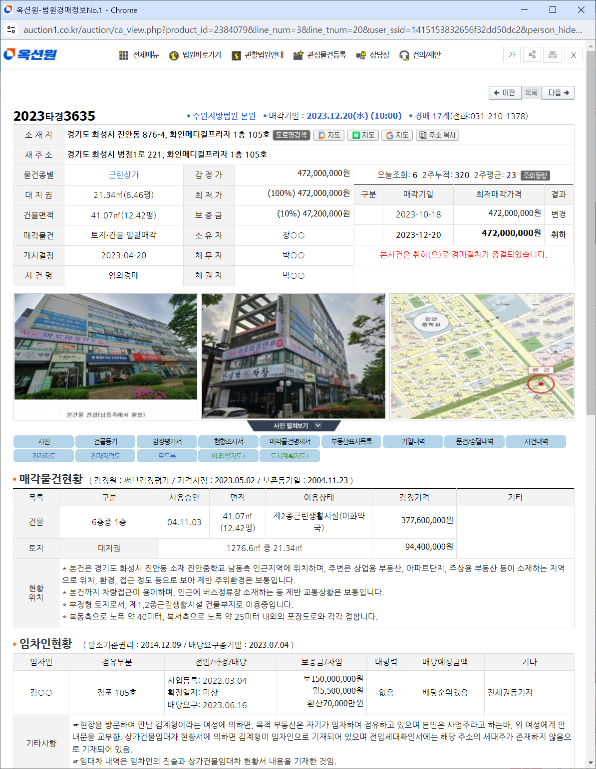 위 사건을 부경꾼 님과 함께 검토해 보았습니다. 유튜브 영상에서도 몇 번 소개된 물건인데, 다른 유료 회원님들도 관심이 많아 부경꾼님께 몇 차례 상담요청이 왔다고 하네요. 화성시의 1층 전용면적 12평 정도의 상가이고, 감정가는 472,000,000원입니다. 소유자와 채무자는 다른 사람이고, 임차인 현황은 사업자등록 2022.3.4, 보증금 150,000,000원, 월세 5,500,000원으로, 임차인이 전세권 등기를 한 것으로 보입니다.