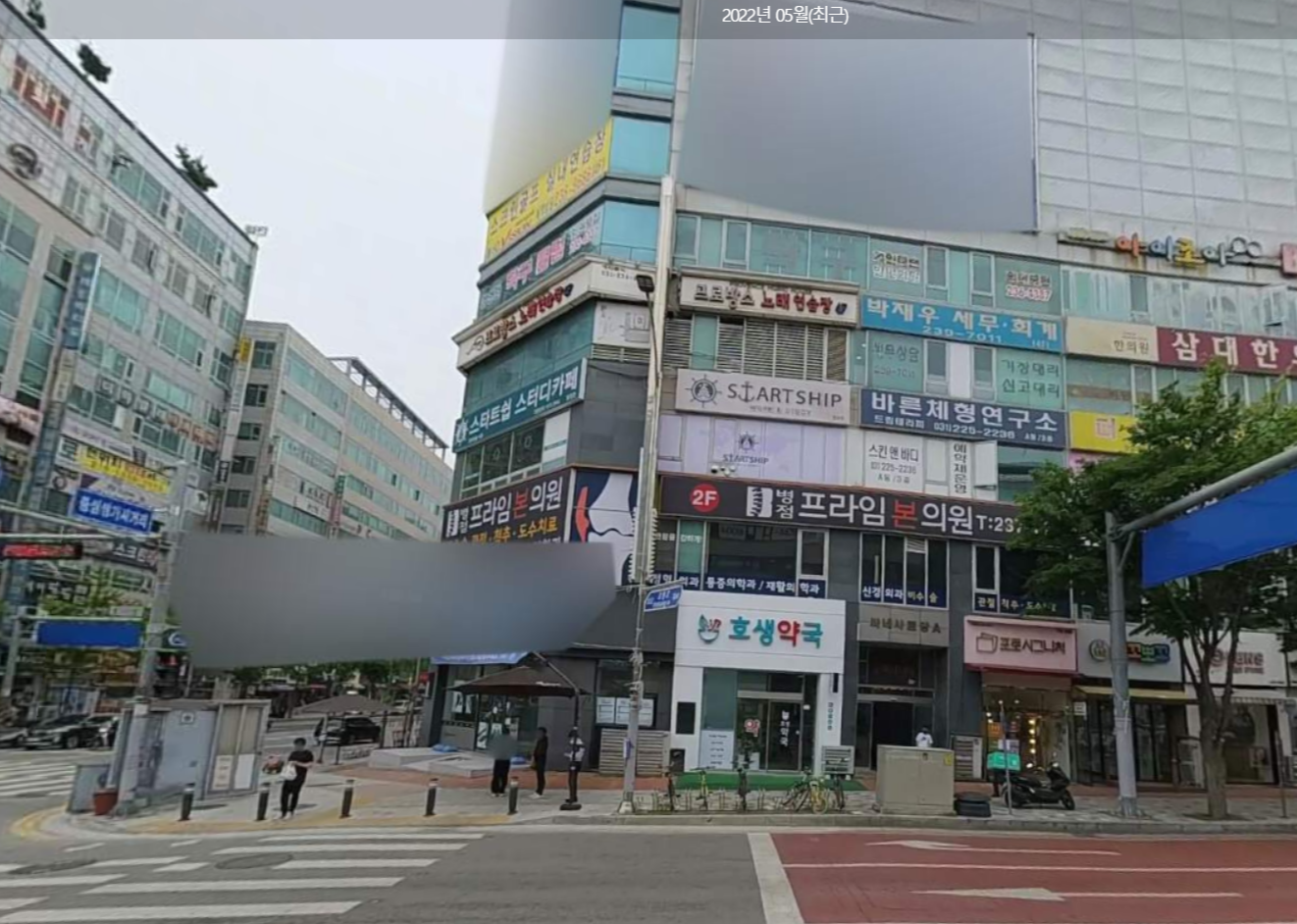 해당 경매대상 상가건물의 대로 건너편, 마주 보고 있는 건물에 2021년 이후 경쟁약국(호생약국) 입점한 모습(아래사진)