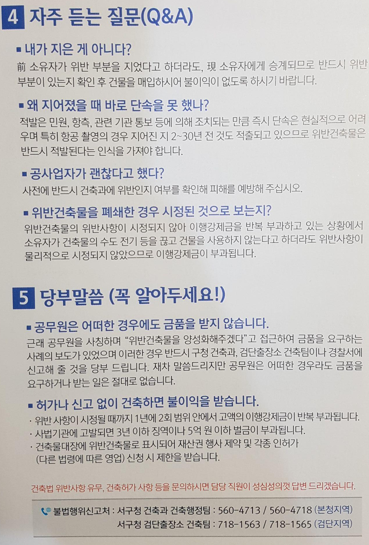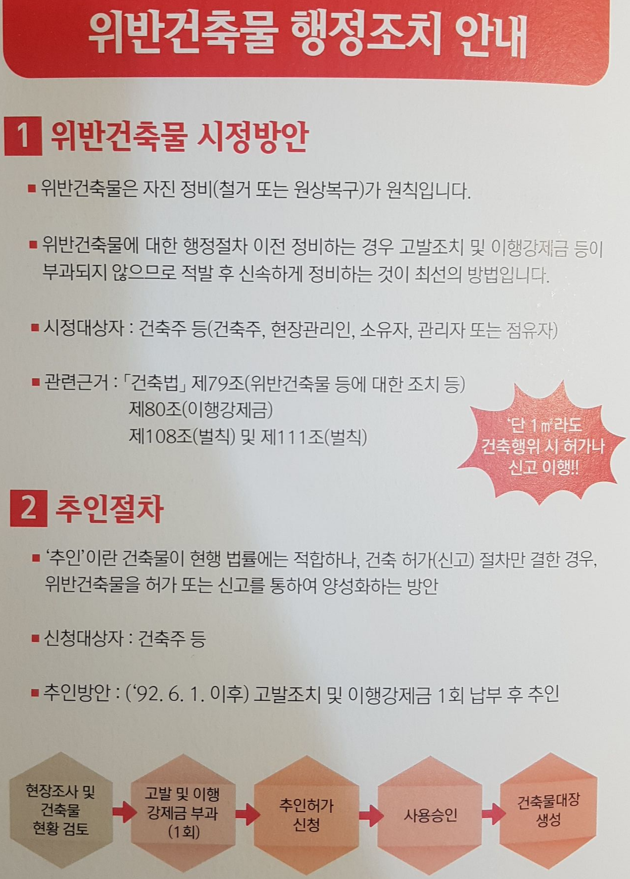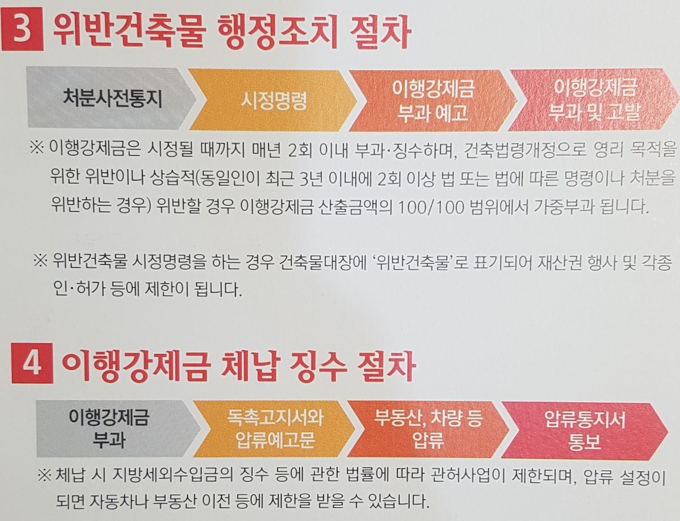 부동산 투자자로서 그동안 궁금하고 잘 몰랐었던 위반건축물 관련 내용에 대해 정말 자세하게 정리가 되어 있습니다. 처벌기준도 생각보다 엄격하네요. 저는 행정복지센터에서 우연히 해당 책자를 발견하였는데, 이 글 상단에 해당 책자 내용을 다운로드할 수 있도록 링크를 걸어놓았으니 필요하신 분은 확인해 보시기 바랍니다. 또한 위의 내용을 잘 숙지하시어, 많은 돈이 들어가는 부동산투자 시 실패하지 않으셨으면 합니다. 모든 분들 성공투자 하시길 바랍니다. 감사합니다.