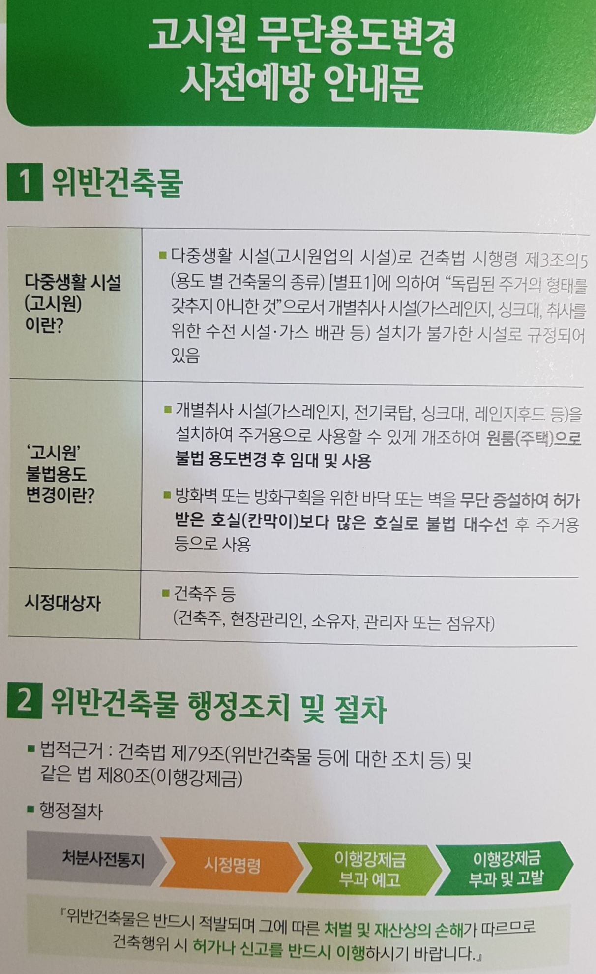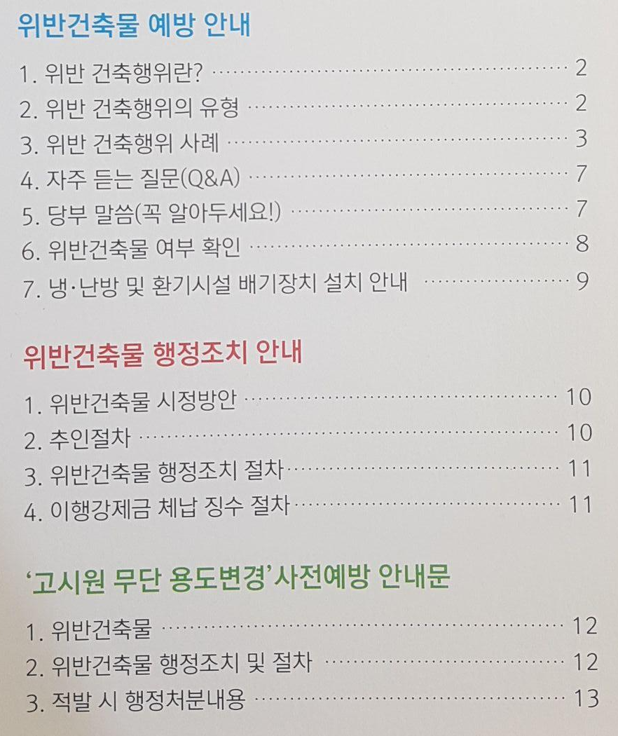 목차는 위반건축물 예방 안내, 위반건축물 행정조치 안내, 고시원 무단 용도변경 사전예방 안내문 등으로 크게 3가지로 나누어져 있습니다.