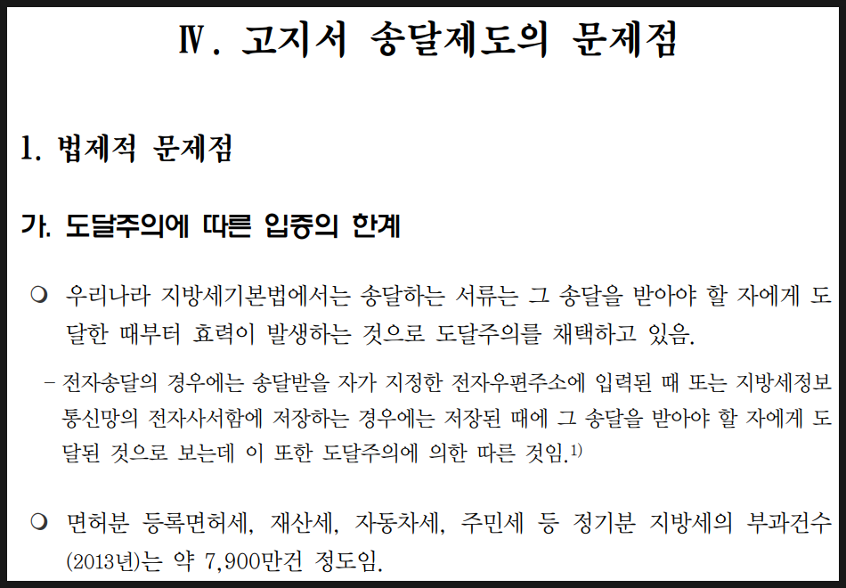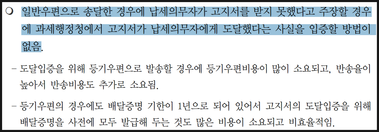 내용을 읽어나가던 중, 고지서 송달제도의 문제점에 대해 정리된 부분을 발견하였습니다. (아래)