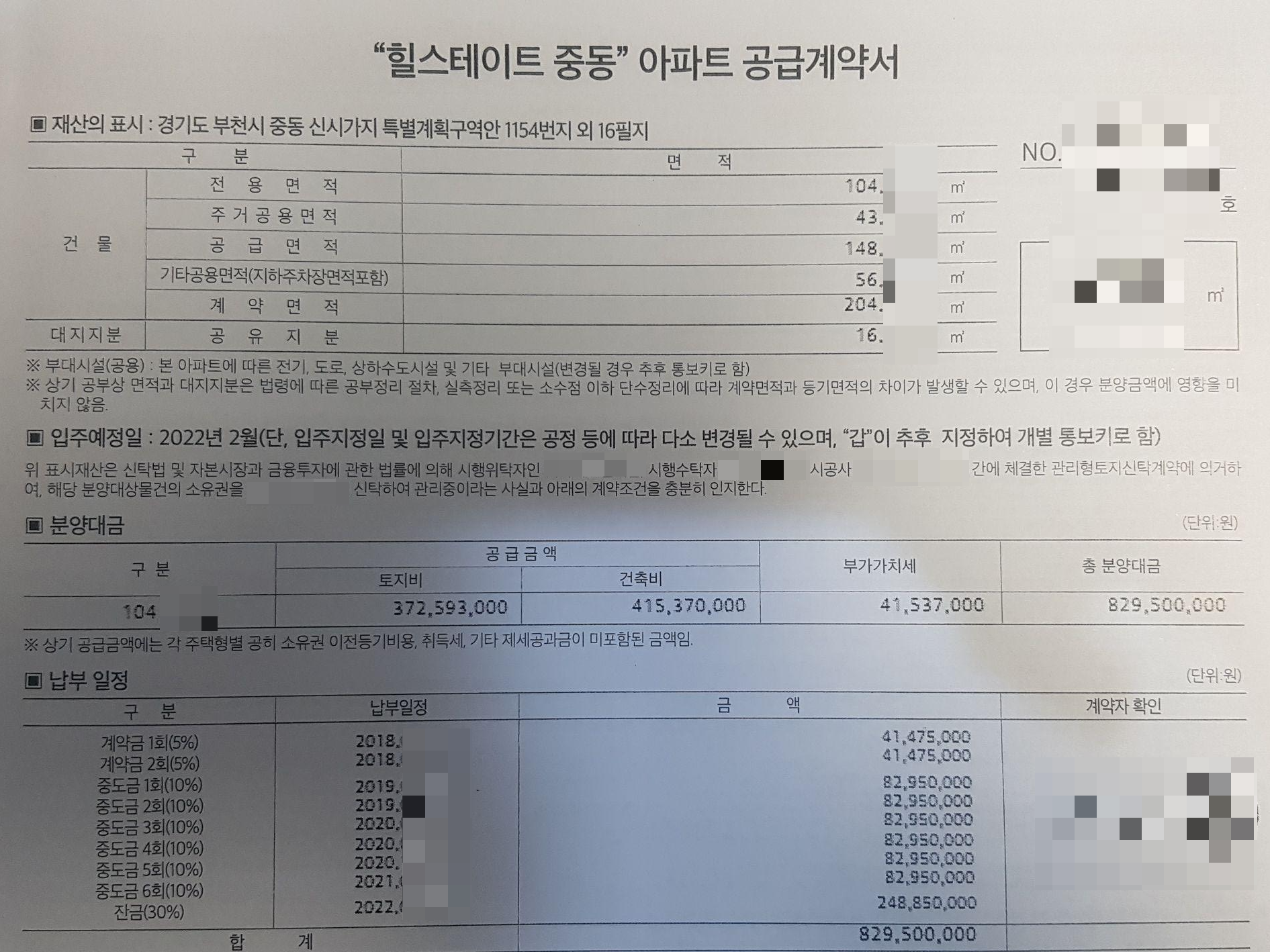 위 공급계약서상 전용 104제곱미터를 8억 2천9백5십만 원에 분양받았습니다. 아파트 청약 및 분양은 처음 받아보았는데, 나도 아파트 투자한 번 해볼까 하는 마음이었던 초심자에게 행운이 굴러 들어왔네요. 위 계약서상 입주가 2022년이니, 현재는 입주가 완료된 상태입니다. 최근에 가보니 아파트 단지 1,2층 상가도 아주 성업 중이었습니다.