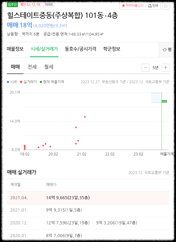 위 사진을 보니, 2021년 이후로는 거래가 많이 없는 듯합니다. 2021년 4월 실거래가는 15억 수준이고, 현재 매물로는 최저가가 18억 수준으로 보입니다. 15억 정도를 시세로 보고, 취득세와 법무사 등기비용 등 감안하면 대략 6억 내외의 시세차익이 있을 것으로 보입니다. 양도세는 감안하지 않았습니다.