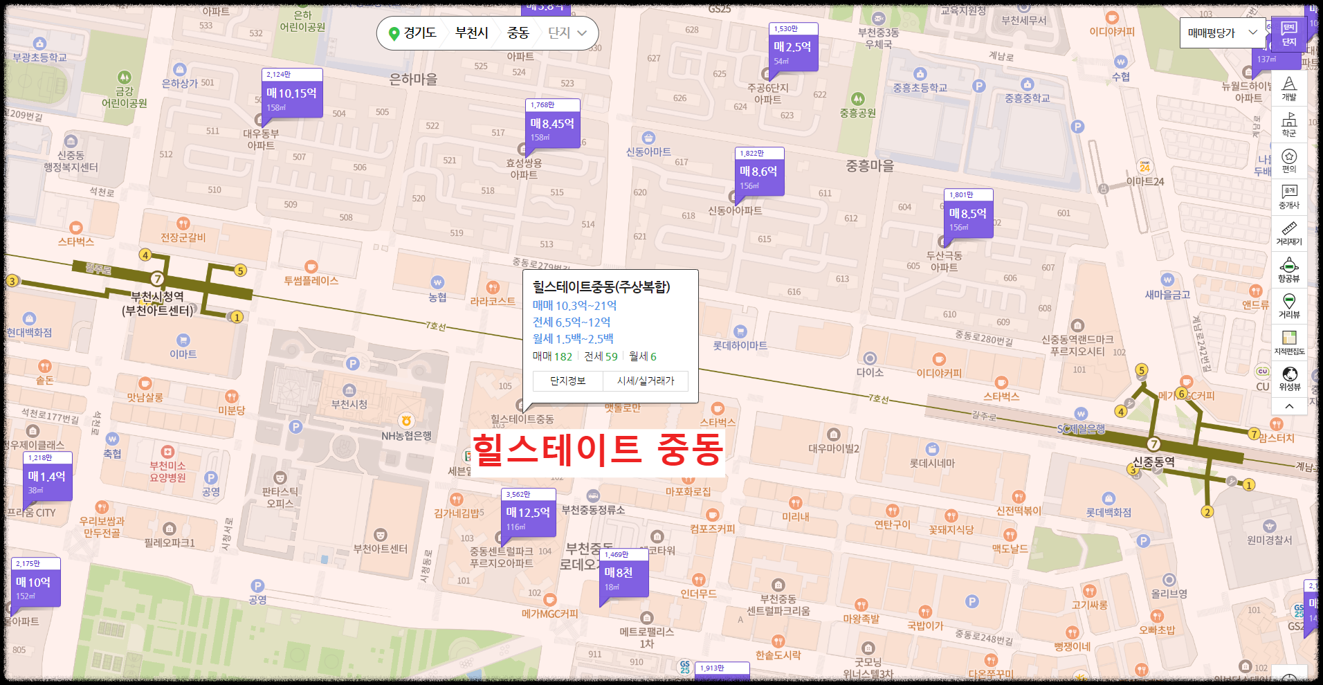 도보 10분 거리에 7호선인 부천시청역과 신중동역이 있고, 주변에 부천시청과 이마트, 롯데백화점, 현재백화점, 중앙공원 등 대형 상권과 쾌적한 환경이 자리 잡고 있으며, 힐스테이트라는 메이커 건설사의 프리미엄까지 있습니다. 부천시 내에서는 정말 최고의 입지로 보입니다.