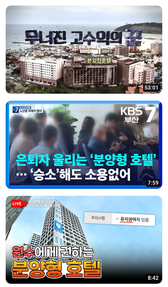 분양형 호텔 광고내용은 여기까지입니다. 위의 내용은 현재 홈쇼핑이나 블로그 등을 통해 광고되고 있는 내용입니다. 부동산 투자에 대한 선택은 자유지만, 위의 분양형 호텔 같은 형식의 사업은 항상 다양한 리스크가 있으니 주의해야 하겠습니다. 겉으로 보이는 호텔은 하나인데, 각 호실마다 소유주가 다르니 운영을 하는데에 여러 가지 잡음이 있을 수 있고, 운영사가 수익을 계약대로 소유주에게 분배하지 않는다거나, 영업 자체가 안된다거나 하는 등 리스크가 있을 수 있습니다. 물론 잘 될 수도 있겠죠. 많은 돈이 들어가는 분양형 호텔 분양 결정은 신중에 신중을 기해야 하겠습니다. 유튜브에 '분양형 호텔'을 키워드로 해서 조회해 보니, 아래와 같은 영상들이 상단에 조회되네요.