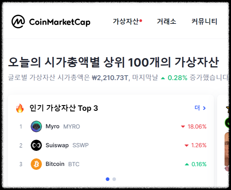 비트코인 ETF 승인으로 미국을 비롯한 전세계와 대한민국 경제, 금융계가 연일 뜨거운 반응을 보이고 있습니다. 참고로, 비트코인 시세 및 전세계 모든 코인가격, 시가총액, 거래량 등의 다양한 정보를 확인할 수 있는 코인마켓캡 사이트를 아래에 링크해 드릴테니 양질의 정보를 얻어가 보시길 바랍니다.