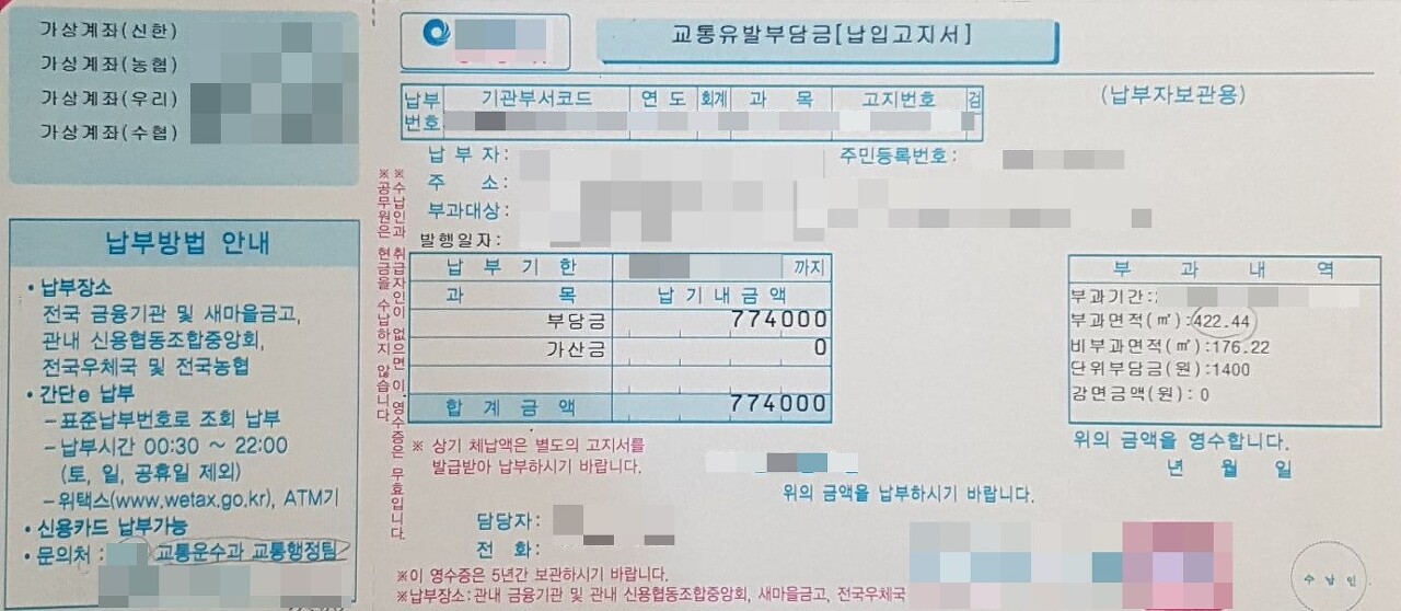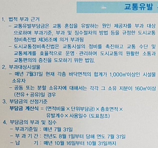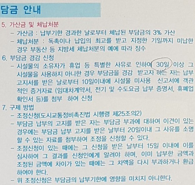 제가 현재 보유 중인 상가는 한 번도 임대계약을 한 적이 없는 공실상태인데, 교통유발 부담금이라는 세금이 있는지도 몰랐습니다. 총 774,000원이 저에게 부과되었고, 처음 보는 세금이라 안내문을 모두 읽어보았습니다. 위 사진을 보니, 법적 부과근거, 부과대상 시설물, 부담금의 산정기준, 부담금의 부과 및 징수, 가산금 및 체납처분, 부담금 경감 신청, 구제방법 등 구청에서 해당 세금에 대해 잘 정리하여 보내주었네요.