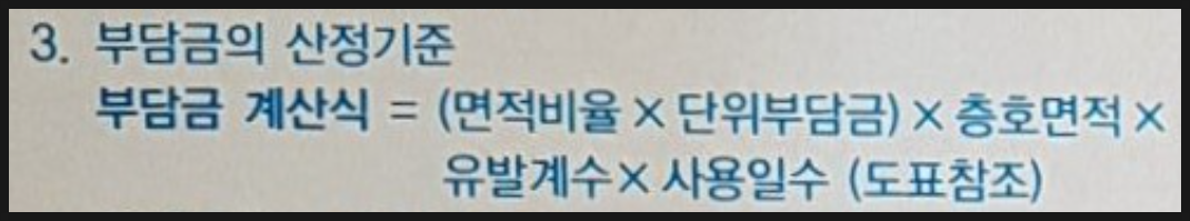 위 Q&A를 보니, 건물의 각 층 바닥의 면적합계가 1천 제곱미터 이상이고, 각 소유자의 전용 및 공용면적이 합산하여 160 제곱미터 이상이면 교통유발 부담금 부과 대상인 것 같습니다. 공용면적 중 주차장 면적은 제외됩니다. 교통유발 부담금 계산 방법은, '단위면적(㎡)Ⅹ단위부담금 Ⅹ교통유발계수' 입니다.