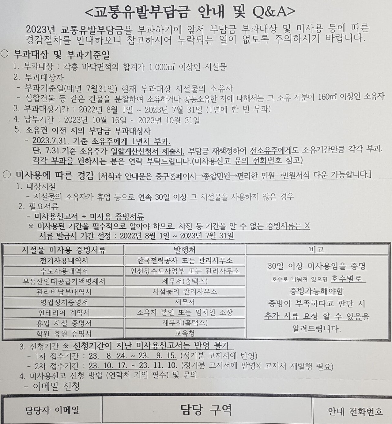 Q&A 내용과는 다소 달라 헷갈리네요. 위 사진의 '면적비율'이라는 개념은 어떤 의미인지 애매합니다. 해당 고지서 상에 제 상가의 교통유발 부담금 계산된 내용이 숫자로 표현되었으면 하는 아쉬움이 있습니다. 오늘은 일정면적 이상의 상가를 가지고 계신 분이라면 부과될 수 있는 교통유발 부담금에 대해 알아보았습니다. 교통유발 부담금 부과를 받으시고 관련 내용이 궁금하신 분은 안내문을 잘 읽어보시거나, 애매한 부분은 구청 등에 문의를 해 보시면 좋을 것 같습니다.