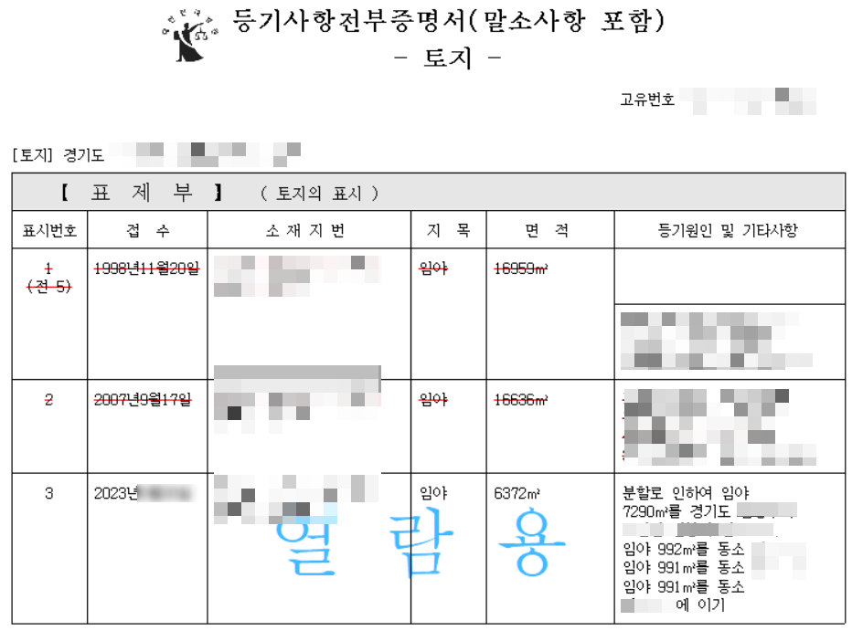 등기사항전부증명서를 발급해 보겠습니다.2022년에 기획부동산으로 추정되는 회사가 약 5,041평을 매매로 취득하였고, 2023년에 총 5필지로 분할합니다. 일단 5필지 중 1개 필지, 약 1,931평(6,372제곱미터)에 대한 내역입니다.