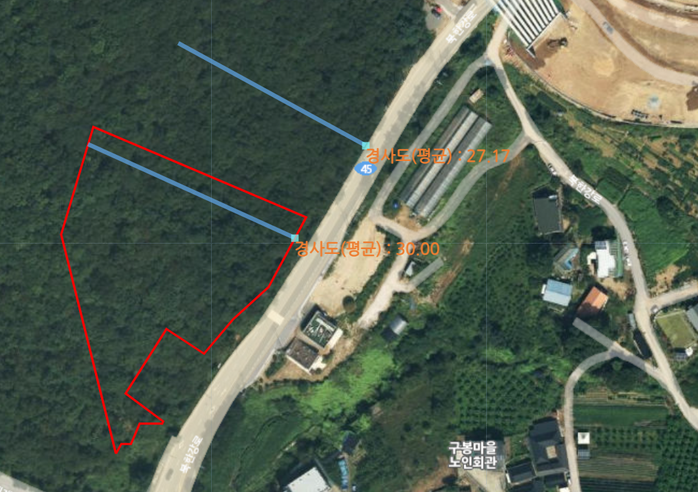 개발제한구역, 배출시설설치제한지역, 공익용 산지, 자연보전권역, 상수원보호구역뭔가 안 좋아 보이는 말이 많이 쓰여있네요..임업정보 다드림사이트를 통해 경사도 측정을 해보니..