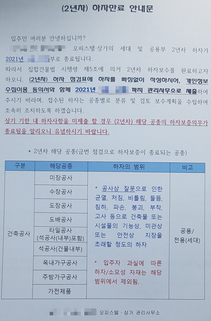 저는 과거에 2룸짜리 인천의 한 오피스텔을 2억 5천만 원에 분양받았고, 현재는 전세로 임대를 주었습니다. 제가 직접 거주하는 게 아니라서 별다른 신경을 쓰지 않고 지냈었고, 오피스텔 사용승인 후 2년이 다 되어가던 어느 날, 관리사무소로부터 아래와 같이 하자만료 안내문을 받았습니다.
