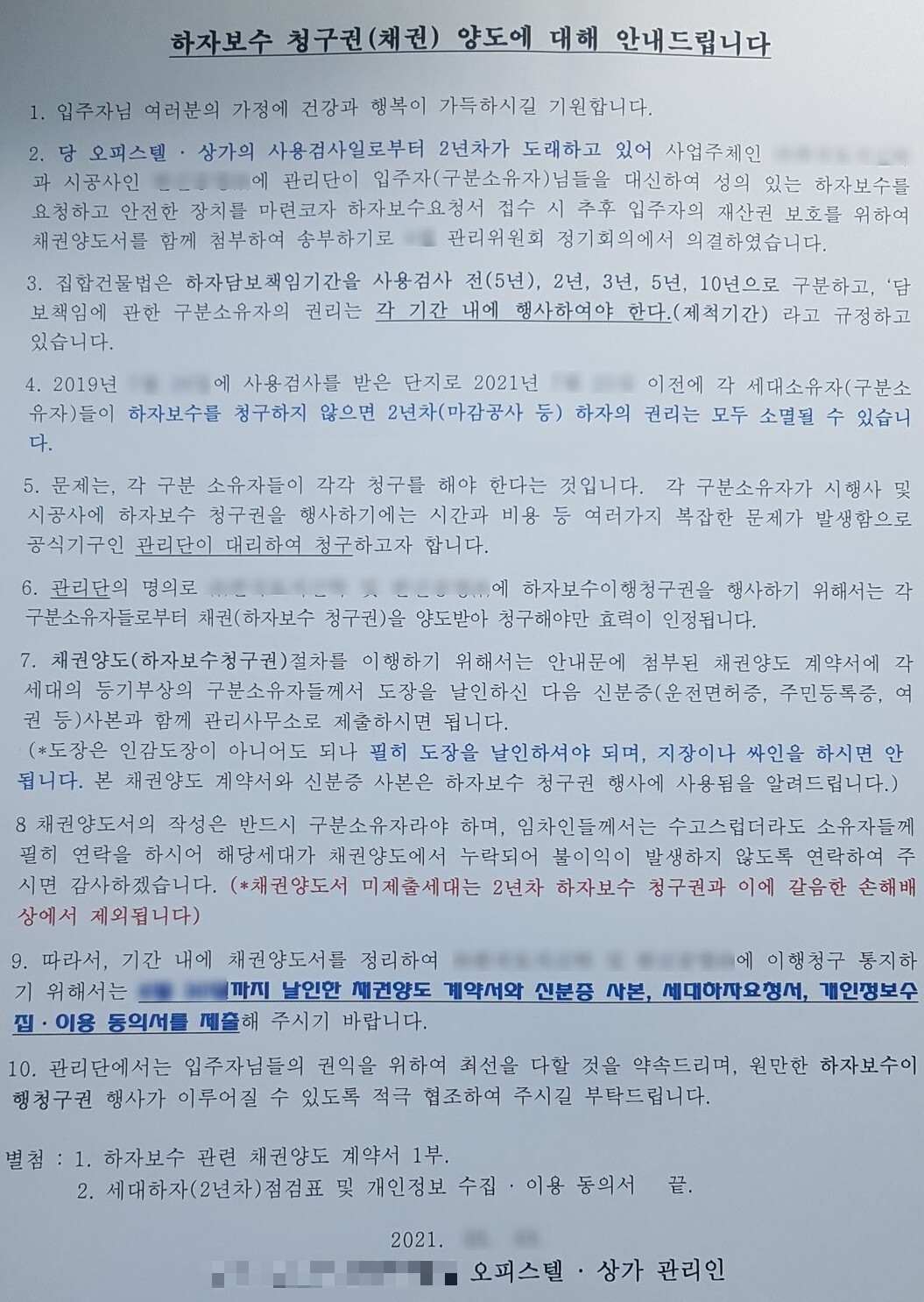 하자보수 청구권(채권) 양도에 대한 안내문