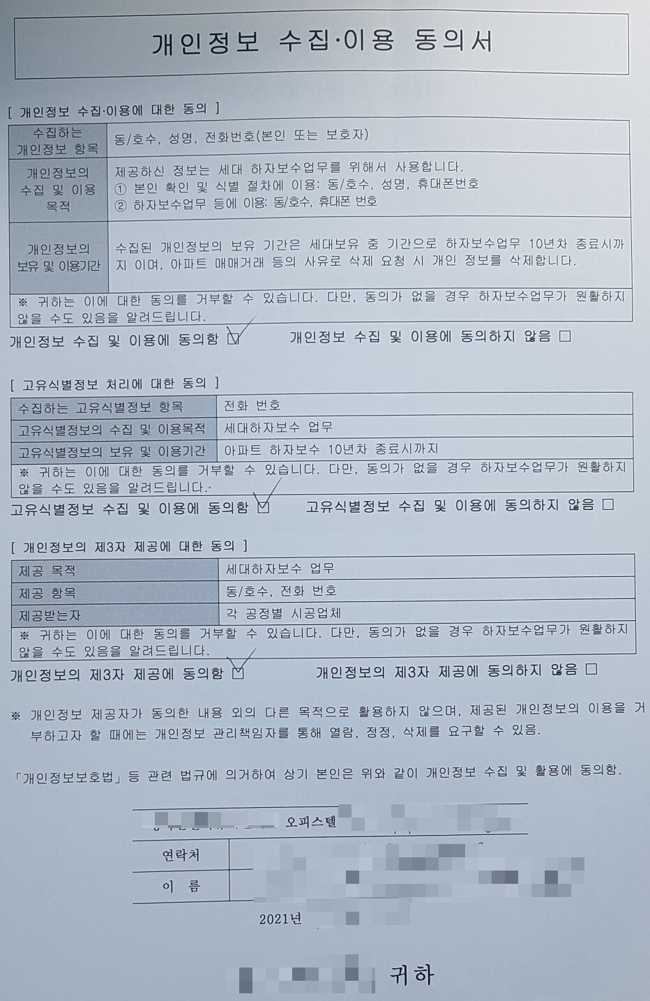 위와 같이 개인정보 수집, 이용 동의서도 작성했습니다.