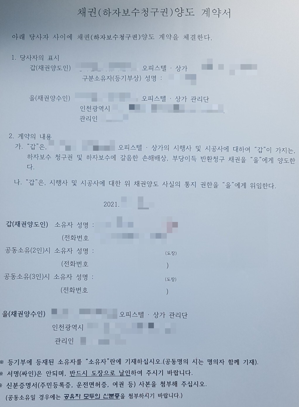 위와 같이 채권(하자보수청구권) 양도계약서를 작성했습니다.