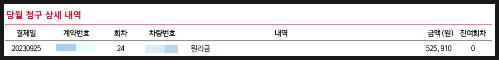 위 청구서 내역을 보니, 처음 36개월에 연장 24개월을 더해서 총 60개월 이었네요. 선납금은 500만원이었고, 처음 36개월은 30만원대 초반, 이 후 24개월은 50만원대 초반이었으며, 모두 합하면 원금과 이자를 더하여 3천만원 수준으로 구매를 하였습니다. 해당 가격은 기본 가격보다 40% 가량 저렴한 금액입니다. 중고차가 아닌 신차 가격이었습니다.