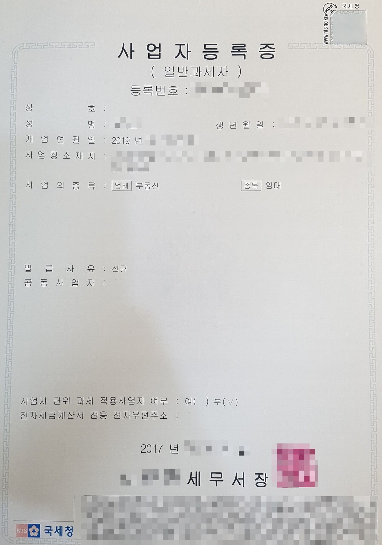 위 사업자등록증상 2017년에 사업자등록을 하였고, 개업연월일은 2019년으로 되어있네요. 2017년에 오피스텔 분양을 받았고, 2019년에 해당 오피스텔의 사용승인 예정이었기에 위와 같이 사업자등록증상에 개업연월일이 2019년으로 표시되었습니다. 현재 완공된 건물이 아니라 하더라도, 건축 중인 건물에 대해서도 위와 같이 사업자등록을 할 수 있습니다.