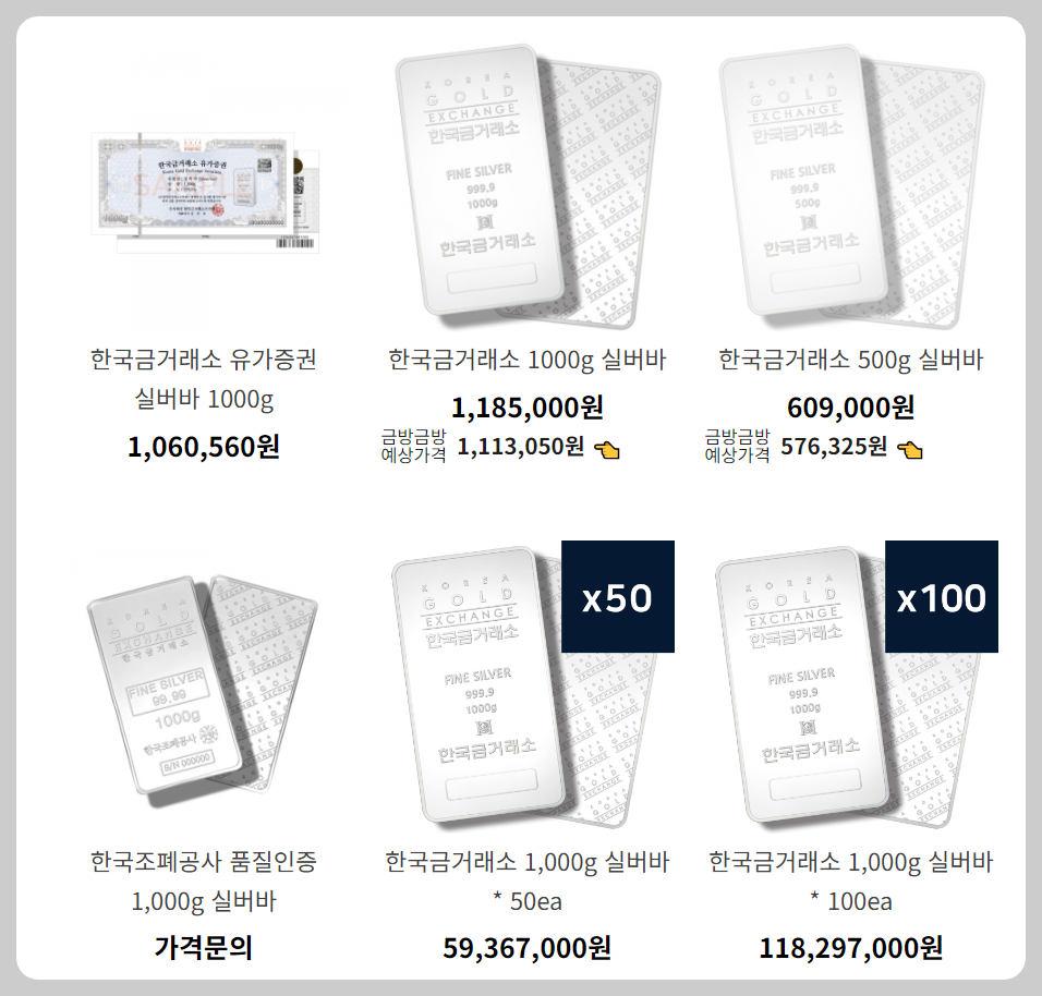 한국금거래소에서 판매하는 실버바는 다양한 상품이 있습니다. 한국금거래소 유가증권 실버바 1,000g, 한국금거래소 1,000g/500g 실버바, 한국조폐공사 품질인증 1,000g 실버바 등이 있습니다. 1,000g 실버바를 50개 또는 100개 단위로 판매하기도 하네요. 이렇게 대량으로 구매하는 분들도 있나 봅니다. 실버바를 사는 분들은 아마도 장기투자 목적으로 사는 게 아닐까 생각됩니다. 은은 세계 어디서나 거래 가능한 자산이기에 환금성도 좋고, 계속 보유하고만 있으면 적어도 손해는 보지 않을 거라는 기대 때문이겠지요.