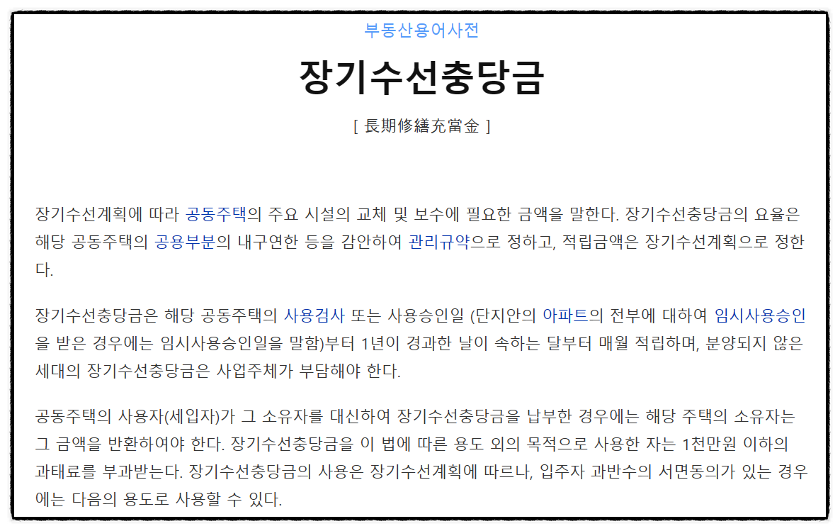 안녕하세요 쿨가이 입니다. 보통 아파트 등의 공동주택에 전세 등 임차로 살게 되면, 매월 관리비를 납부하게 됩니다. 관리비 내역에는 여러 항목이 있는데, 항목 명칭만 봐도 대부분 어떤 의미인지 쉽게 알 수 있습니다. 예를 들어 청소비, 화재보험료, 주차비, 전기료, 수도료 등등... 이러한 항목 중에 '장기수선충당금'이라는 항목이 있습니다. 어떤 의미 일까요?