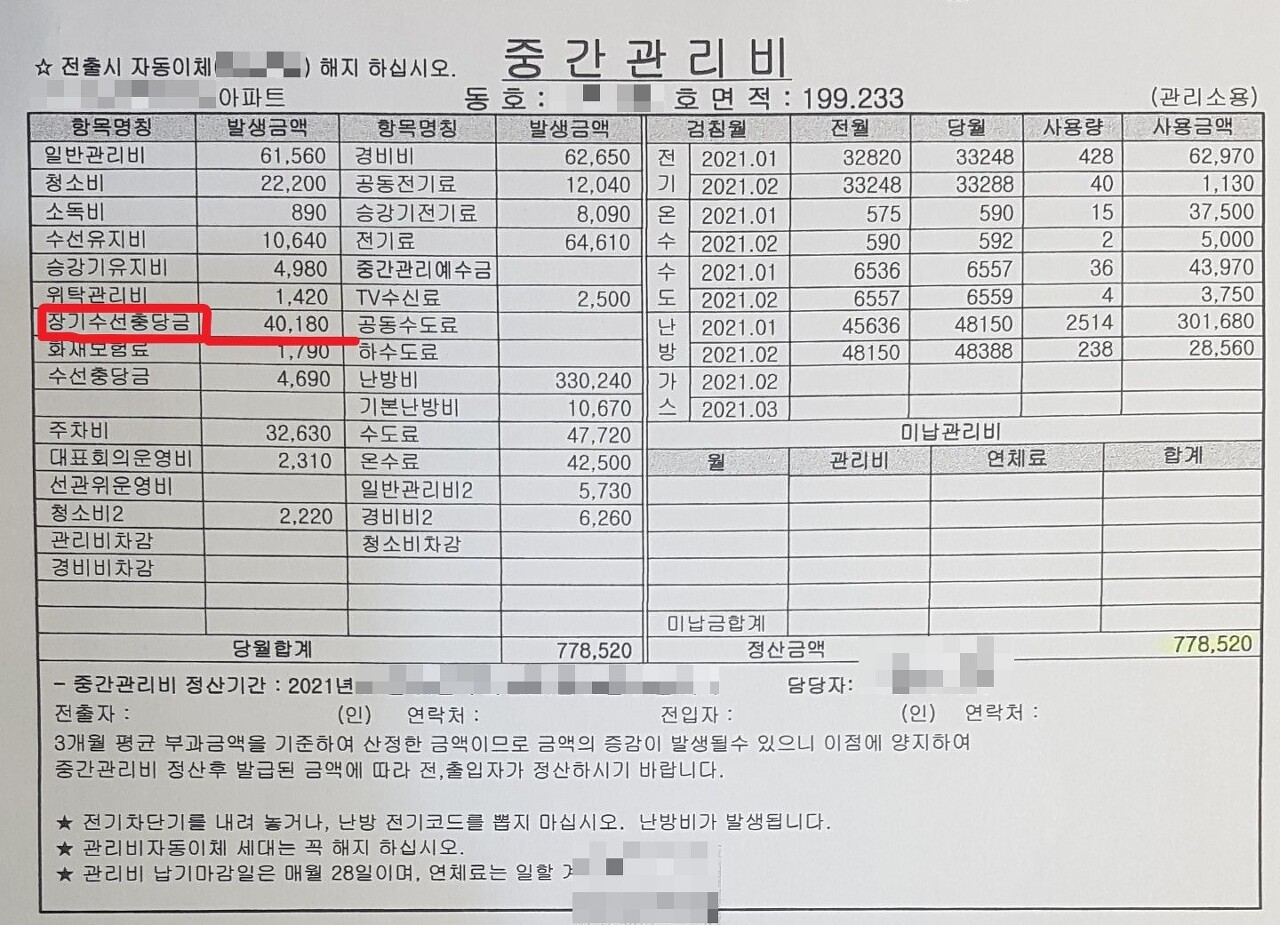 월 장기수선충당금이 4만 원 정도 나왔네요.