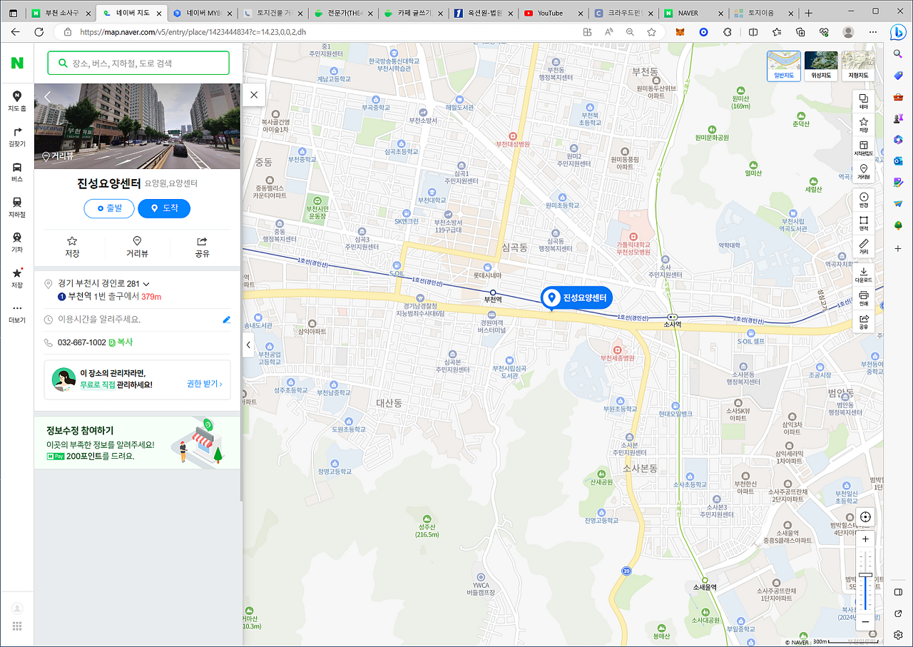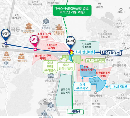 부천역이 좀 더 가까운 것 같지만 대곡소사선 개통예정+서울로 조금 더 가까운 역이라 '소사역' 으로