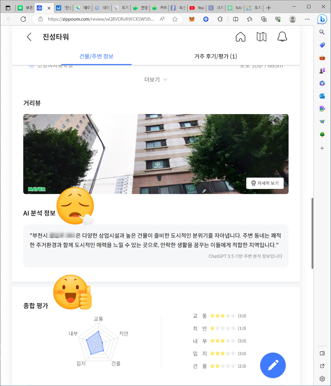 'AI분석정보'에는 '쾌적한 주거환경' 이라고 되어있는데,