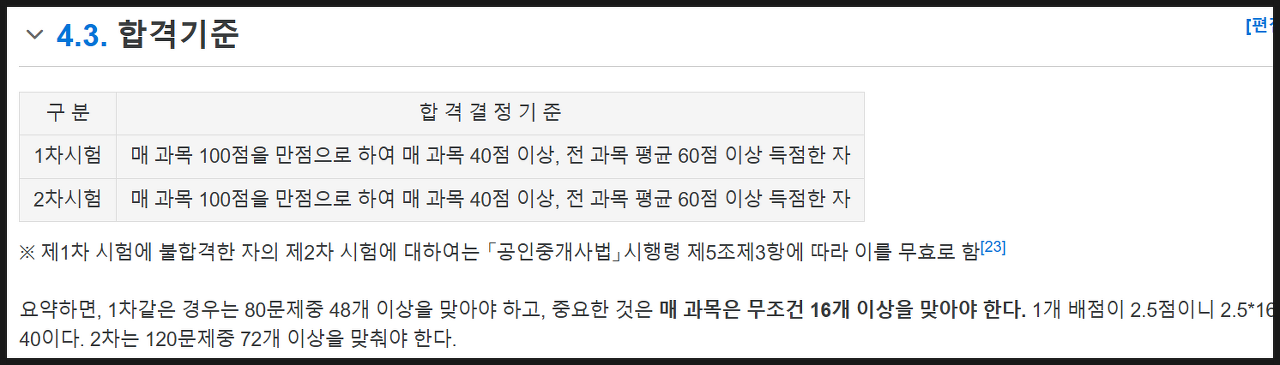 공인중개사 합격기준은, 과목당 40점 미만의 과락이 없어야 하고, 평균 60점 이상이 되면 됩니다. 저는 2019년에 1차 시험에 합격했고, 2020년에 2차 시험에 합격했습니다. 공부를 어떻게 했는지 자세히 기억이 나진 않지만, 그저 짬날 때마다 했던 것 같습니다. 합격후기를 기간별, 시간별로 자세하게 쓴 분들을 보면 대단해 보입니다. 공부했던 과정이 어떻게 저렇게 기억이 다 날까 하는 생각이 듭니다.