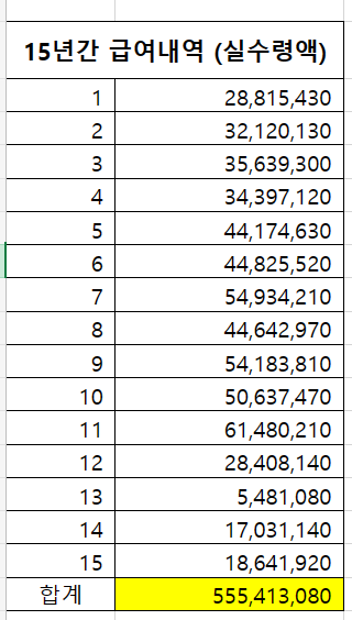 안녕하세요 쿨가이 입니다. 저는 한 직장을 15년 정도 다니고 있습니다. 문득, '내가 신입사원때부터 이때까지 회사에서 월급을 얼마나 받았을까?' 하는 생각이 들었습니다. 현재 신입사원 때보다는 연봉이 많이 올랐고, 그간의 실수령액을 다 더해보니 아래와 같습니다.