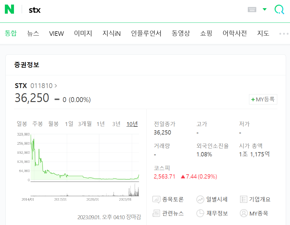 10년 전에는 주당 320,000원이나 했습니다. STX도 역시 샐러리맨 출신 강덕수 회장이 일구었던 회사인데, 결과는 좋지 않았던 것 같습니다. 당시 신입사원은 해외 크루즈 연수를 보내준다는 기사를 봤었고, 저도 STX 공채 신입사원에 지원했지만 떨어졌었습니다.ㅋ