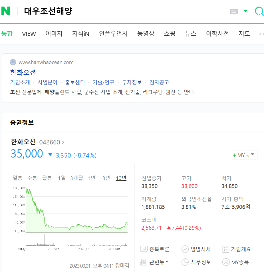 2012년 드디어 한미 FTA가 발효되었고, 무역이 더욱더 활발해지면서 관련산업인 조선업도 잘 될 것 같아 매수했었습니다. 예전에 대우조선해양이 부도나버렸다는 얘기는 들었던 것 같은데, 한화오션으로 바뀌었나 보네요.10년 전 주당 190,000원에서 현재 35,000원 수준이네요. 80% 이상 폭락입니다.